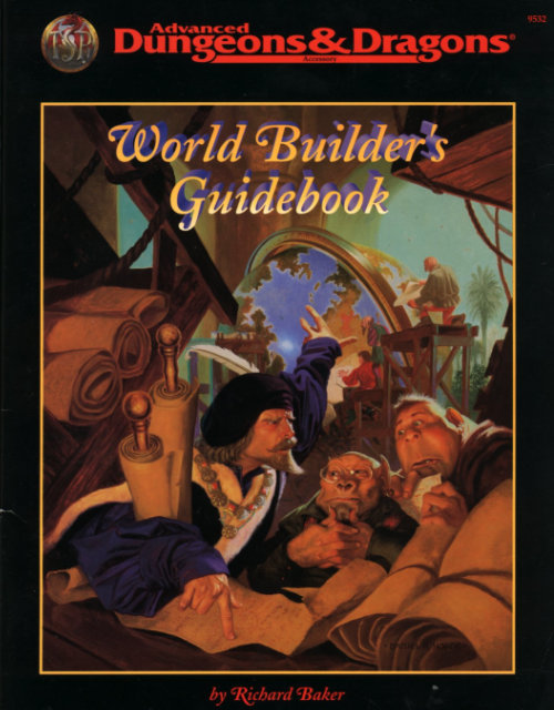 Once upon a time when D&D was young and called ‘Advanced Dungeons and Dragons,’ I got my hands on this supplement, the ‘World Builder’s Guidebook’. It has many tables and describes many options an inspiring DM can use to create a world of their own. Tables for resources, kingdom sizes, tables to help generate populations and many, many hexagonal maps.
